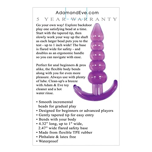 Go your own way! Explore backdoor play one satisfying bead at a time. Start with the tapered tip, then slowly work your way up the shaft as each and every larger bead puts you to the test – up to 1 inch wide! The base is flared wide for safety – and doubles as an ergonomic deal with so you’ll be able to navigate with ease. Designed for beginners or advanced players. All the time use a number of lube and clean up with Adam and Eve toy cleaner and a hot water rinse. Dimensions: 4.32 inches long, up to 1 inch wide , 2.47 inch wide flared base. Waterproof . Five Year Warranty.