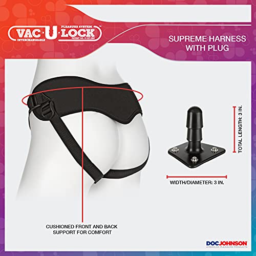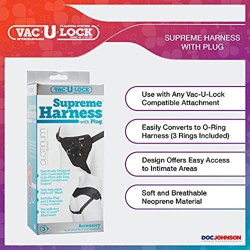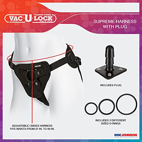 INCLUDES: Our black adjustable unisex harness fits waists from 27 inches to 69 inches. This harness is compatible with any Vac-U-Lock toy suction attachments, Vac-U plug is included, and can be converted to an O-Ring harness (3 rings sizes).
