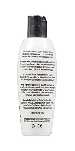 PINK Natural is our new water-based lubricant designed for women and couples on the lookout for very high-quality body-conscious formulations. PINK Natural combines de-ionized water and Organic Aloe Vera Gel, fortified with extracts of Ginseng, Guarana, and Avena Sativa (Oat). We minimized or removed most other ingredients from our very popular PINK Water formula to create PINK Natural.